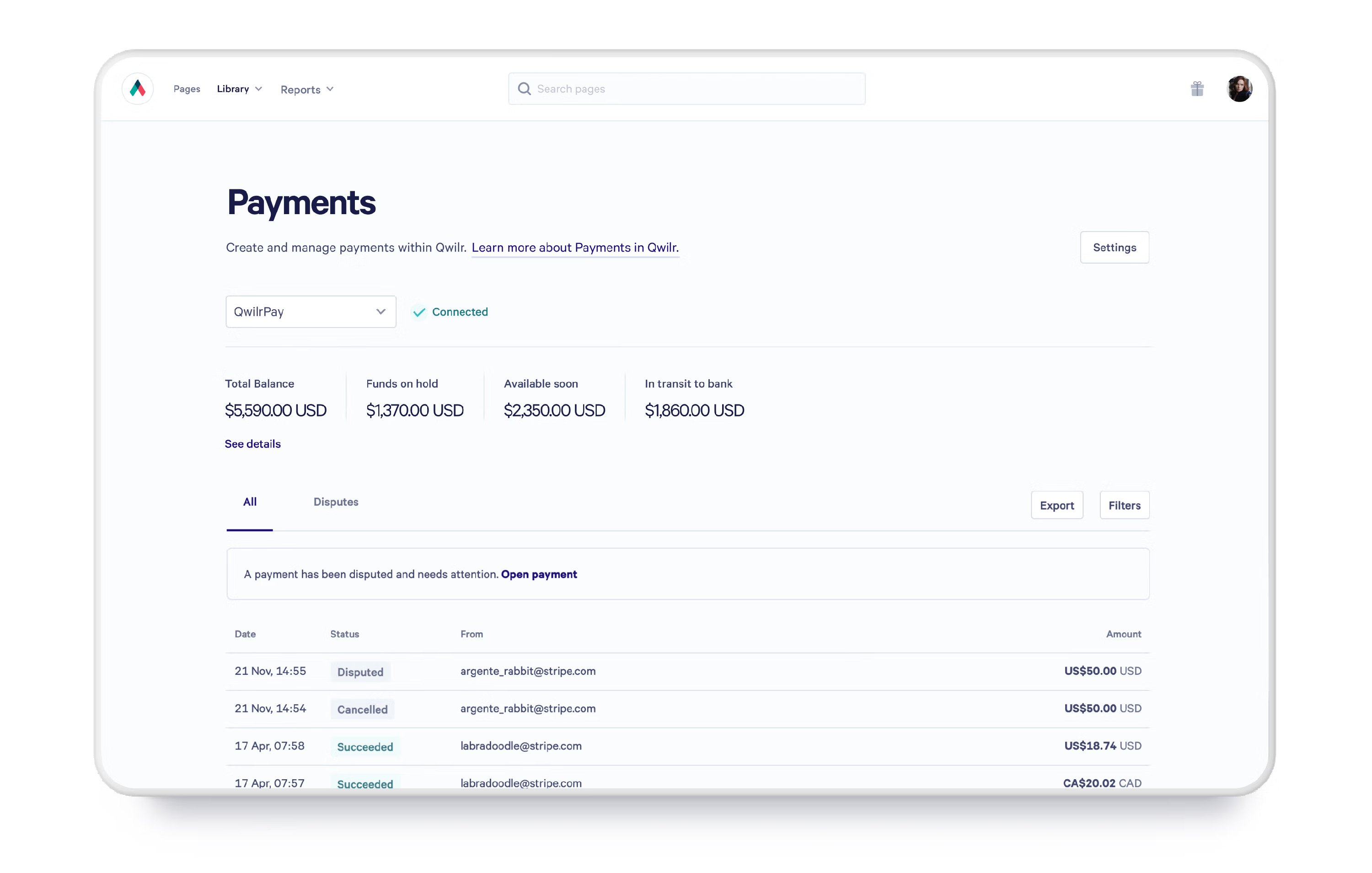 While you can certainly review your transaction history in Stripe, as an Admin in Qwilr you are able to find that same payment information by heading back to Library > Payments section of your Qwilr Account.