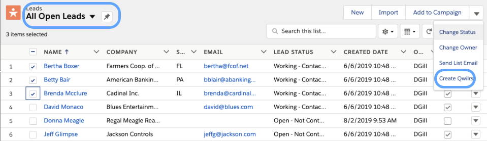 In the example below, we've selected 3 leads in the All Open Leads view. The Create Qwilrs button will allow your users to create Qwilr Pages for these leads in seconds.