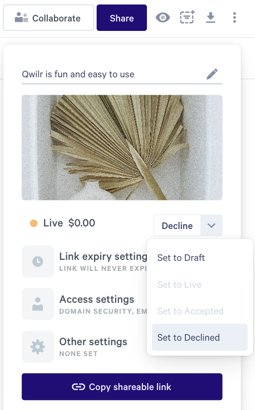 The Page will retain a Live status, although it's been disabled by the view limit. If you'd rather mark the page as Declined, click the Share button to access the settings pop-up. There, you can choose the Declined status.