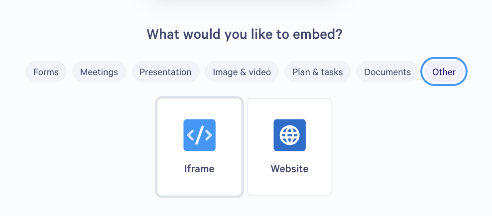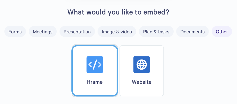 Step 2. From here, you'll see Categories - select Other and iFrame and then enter in your site/service's iframe code.