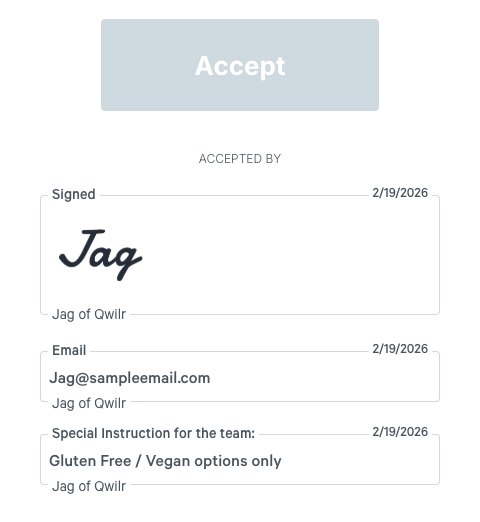 Aside from the name or signature of the acceptor. They'll also see their email address and organisation, and if they’re using a custom form, we’ll include the answers they submitted too.