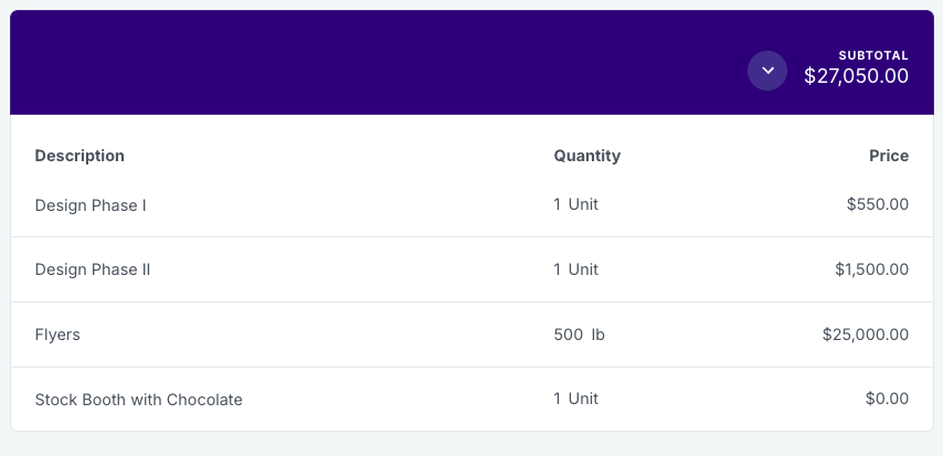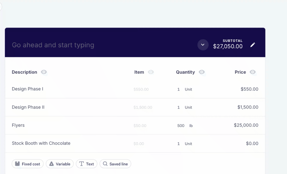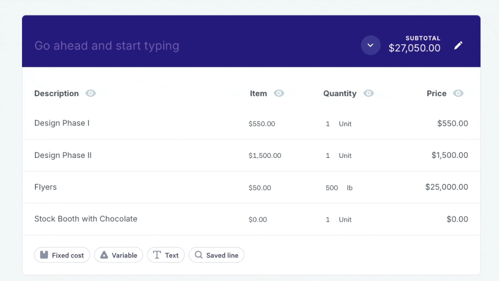 Sometimes you don't need all the details in your quote. You can hide or show each column of a table section by clicking on the icon next to the column heading.