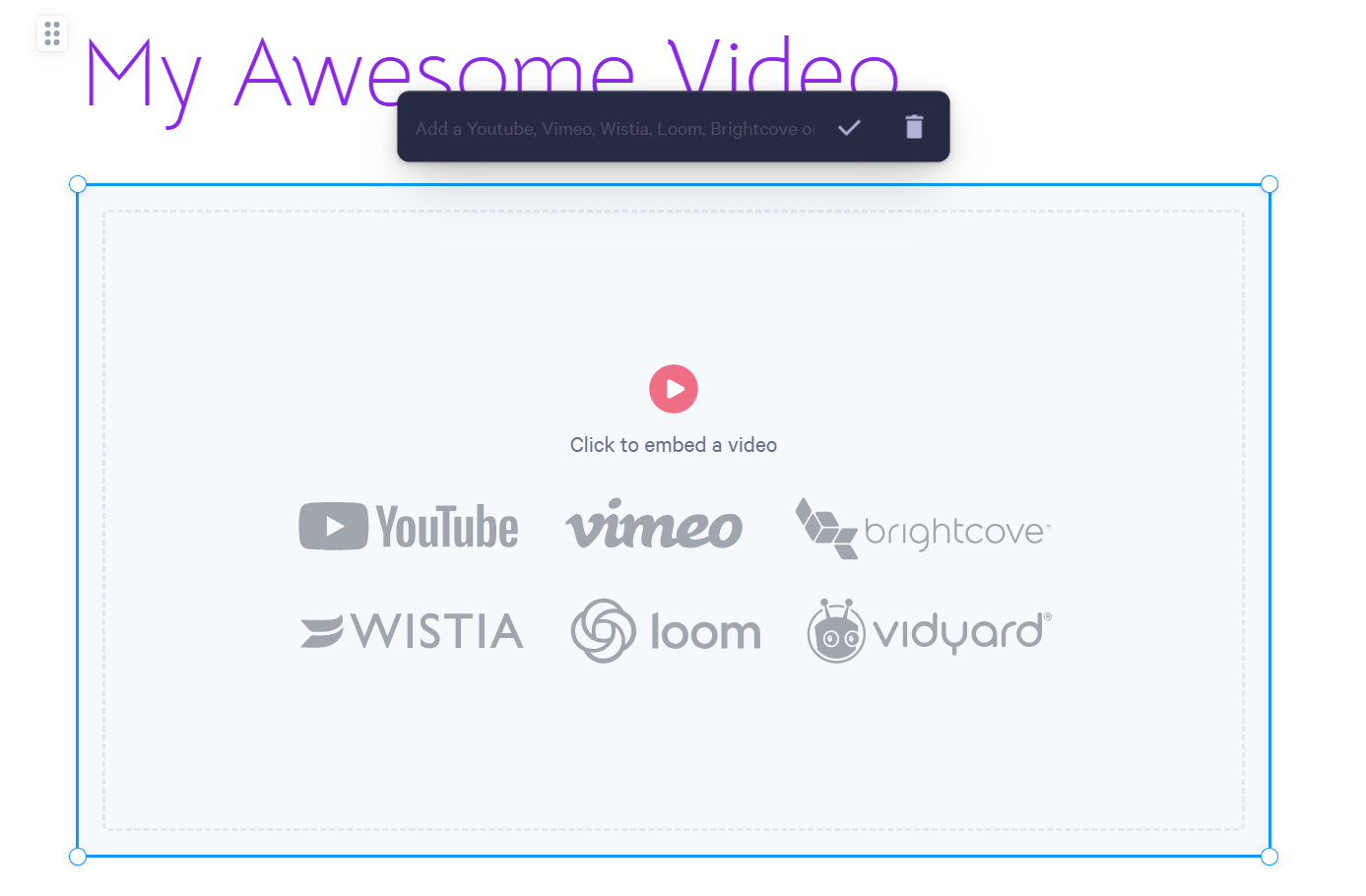 A toolbar will appear. Paste in the URL to your video, and click the ✔️ to save your video. (See the sections below to learn how to locate the URL.)