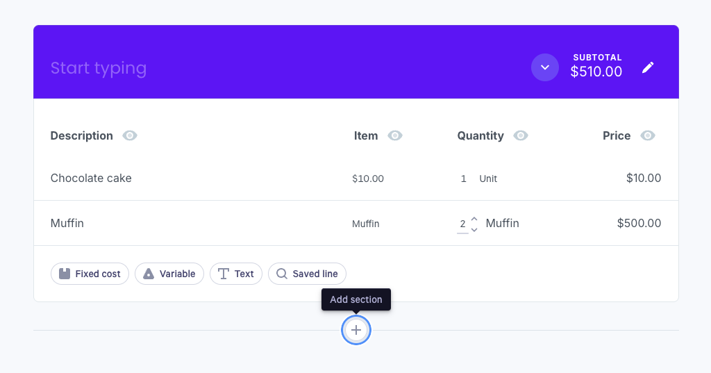 You'll use sections in your Quote Block to group the various elements of your packages. To add a new section, click the + symbol at the bottom of the current section.