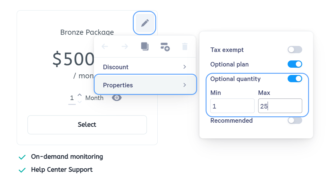 If you're using a Table quote style, head to the line item where you want to add a quantity range. Click on the Line Item Options icon, and then choose Properties. Enable the Optional Quantity switch. and type in your minimum and maximum quantities.