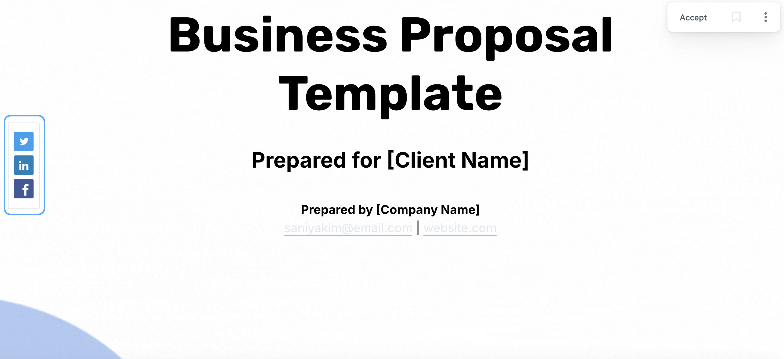 Now you'll see Twitter, Facebook, and LinkedIn buttons in the first block of your Qwilr Page. When your clients click on them, they can start a social media post with your page name and URL automatically filled in.