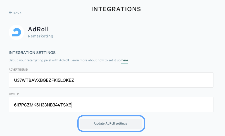 Step 7. Back in Qwilr, paste those two ID codes into your integration settings and click Update AdRoll Settings.