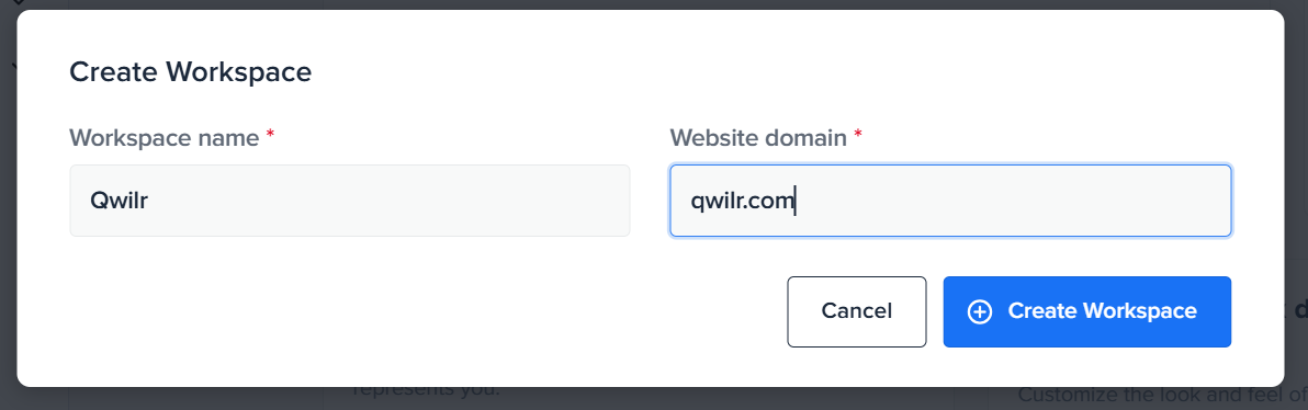 Step 2. Here you will set your Workspace name and your Website domain then click on Create Workspace.