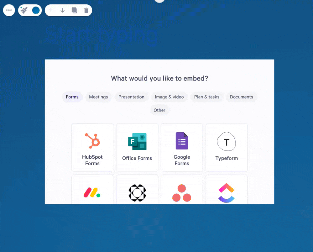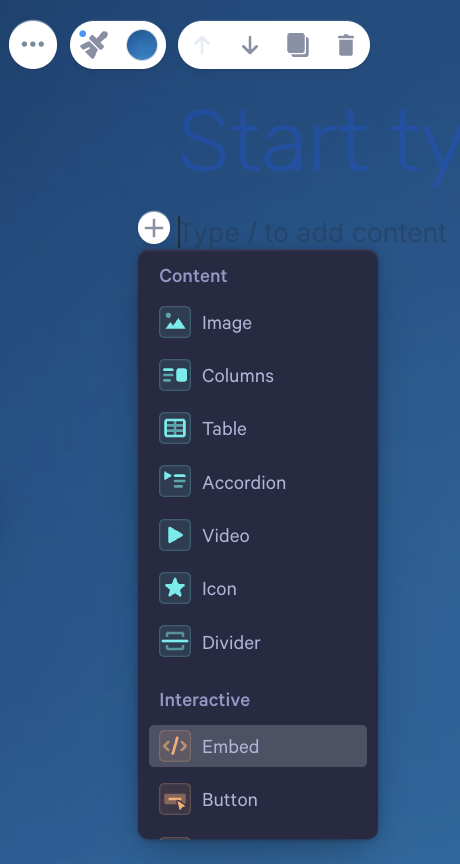 Step 1. Anywhere you're able to click on the + symbol in your Qwilr Pages and Templates, you'll now see the option to add embedded content from services like Google Forms.