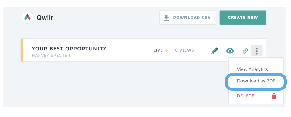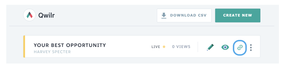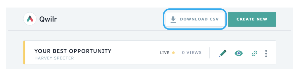 At the top of the Qwilr widget, you'll see a button that downloads a CSV file. The file will contain the names, current status, and URLs of all of the Qwilr pages you've created from this Salesforce record.