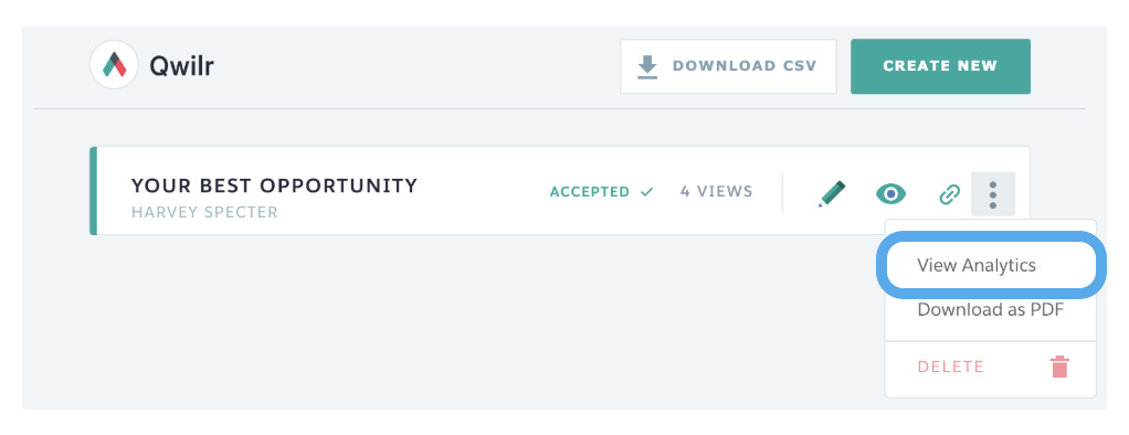 Step 5. Success! You've created a Qwilr Page. You'll now see a mini dashboard for that page in the Qwilr widget. You'll be able to see the current page status here, as well as the total number of views it has.