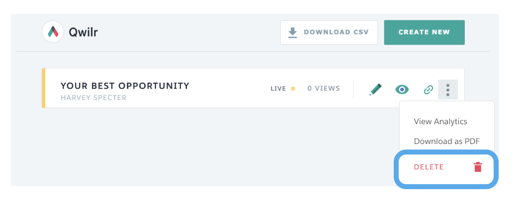 You can delete any page that hasn't been accepted yet. When you click Delete, the page will be removed from the Qwilr widget and from your Qwilr account. You can learn more about deleted pages here.