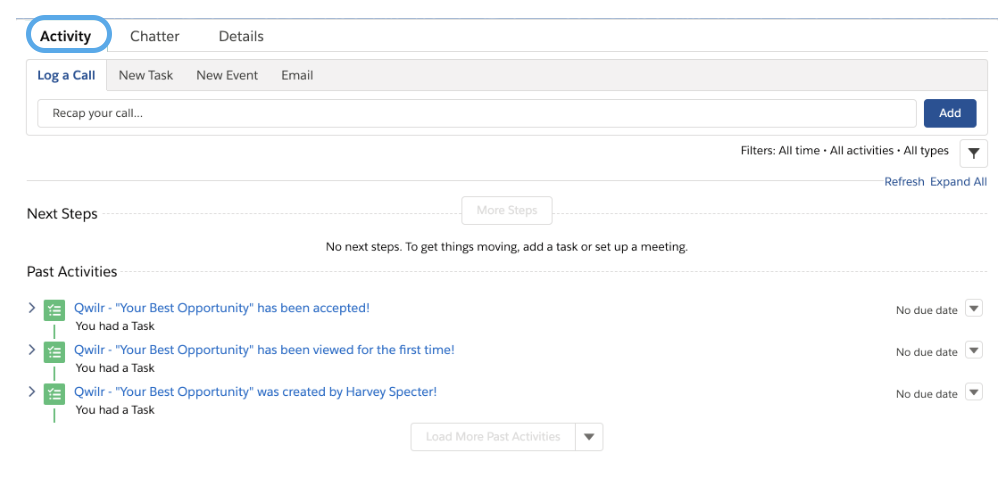 You can see all of the activity for this page in the Activity tab of your Salesforce record. This activity feed includes the first view of the document and when it's accepted.