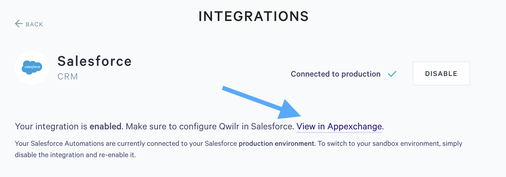 Occasionally, the integration may need to be refreshed, for instance, if you're planning to start using Salesforce automations. In such cases, you'll need to disable and then re-enable the integration.