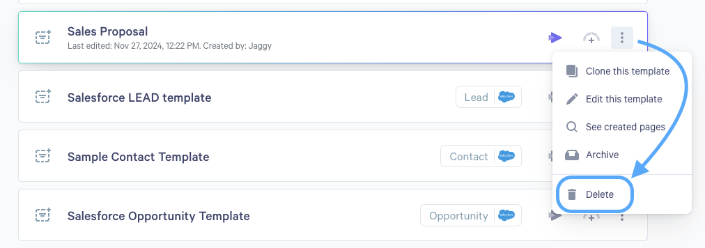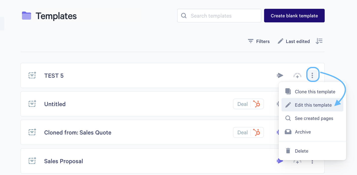 Then, on your templates list, if you have no child pages connected to it, the HubSpot connected Qwilr Template will allow you to select Delete