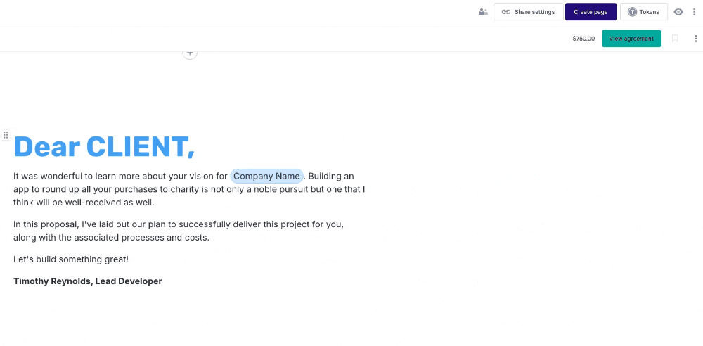 To create a template for HubSpot, you'll build a Qwilr Page, convert it, and then add some "tokens" to pull in details from your HubSpot records.