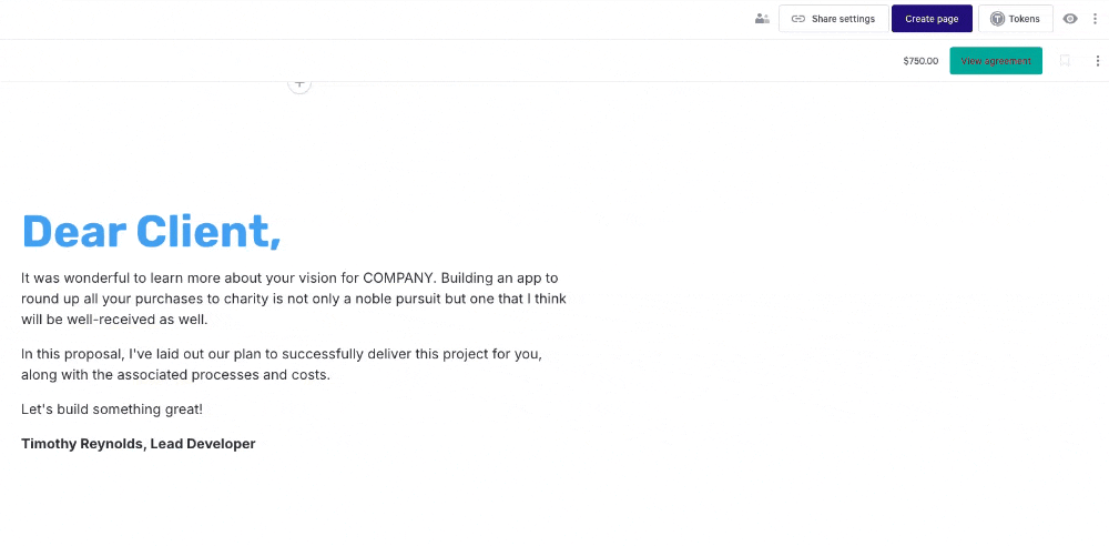 Next, you'll need to set up the spaces in your Qwilr template where these visuals will go. You'll add placeholders, and then attach the new tokens to them.