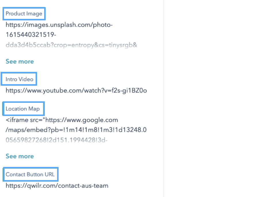 In your HubSpot account, you'll need to set up one or more custom fields for each type of visual you'd like to use. These fields should be "multi-line text" fields.