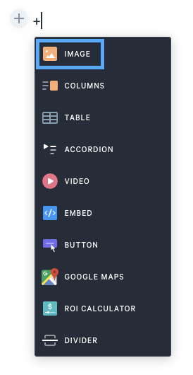 Step 1. Open your template for editing. To add an image placeholder, click on the + symbol that appears on any blank line. Then choose Image from the menu.