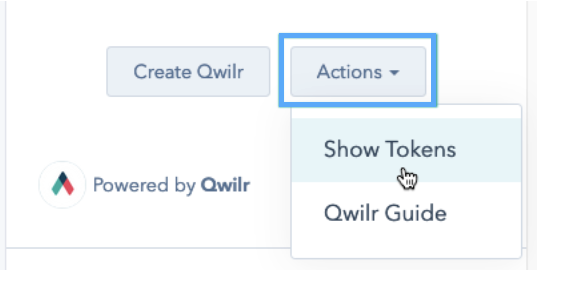 The best way to find the correct formatting is in your HubSpot account. Click the Actions button in the Qwilr widget, and choose Show Tokens. You'll see a list of available tokens in the correct format.