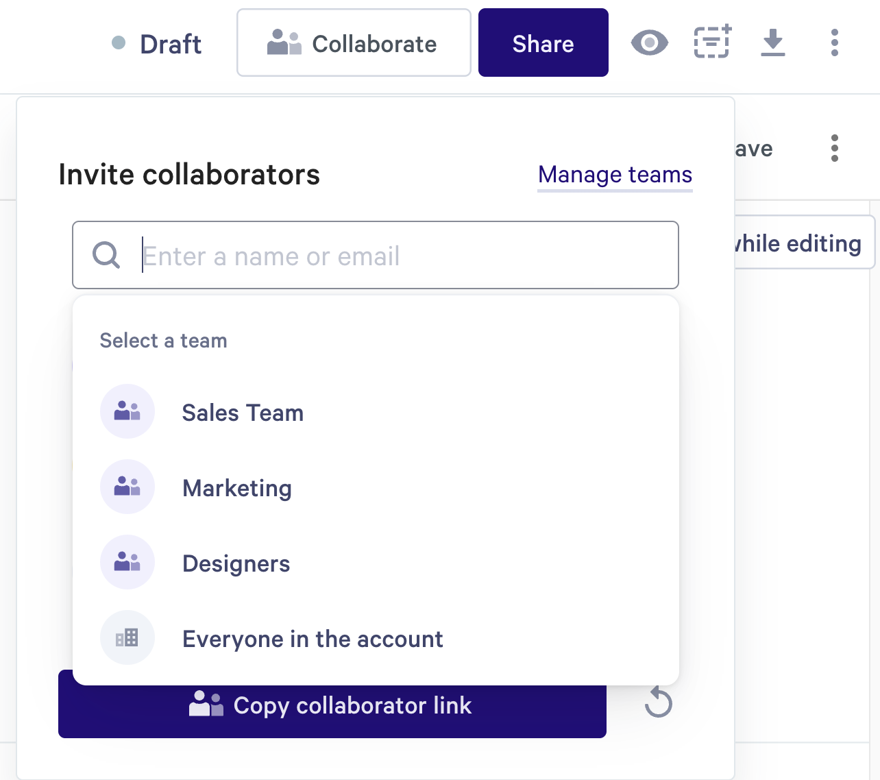 You will now be able to share a project with the whole Team at once. To do this, click on the Collaborate icon as you're editing the Page.