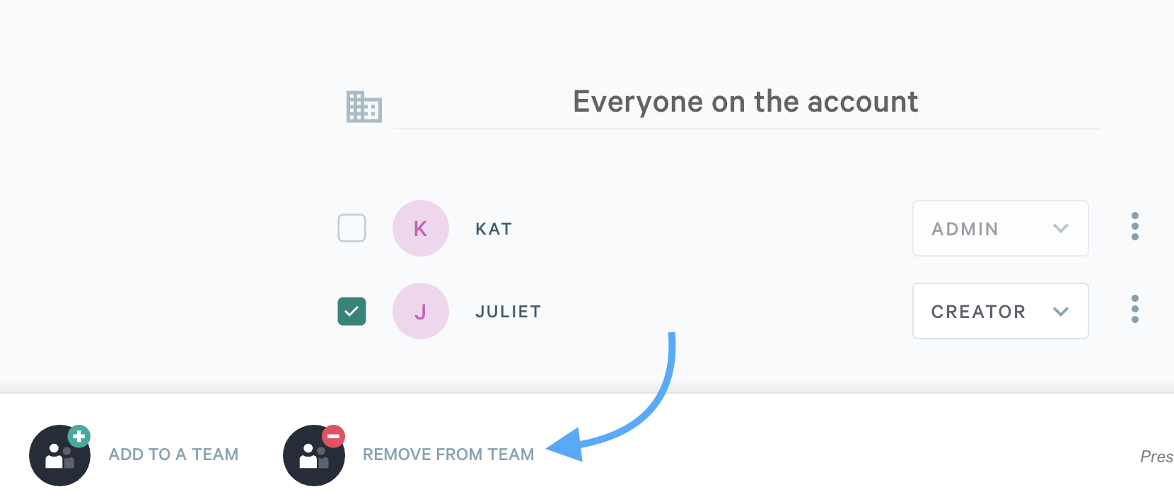 Method 2. On the same Page, scroll down to the list of Everyone on the Account. Select a Team member (or several) by clicking the checkbox next to their name. You'll see a bar pop up at the bottom of the Page. Click Add to a Team.