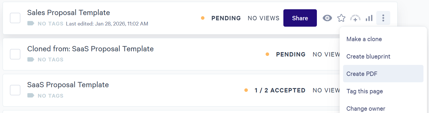 Alternatively, on the dashboard you can click the More Actions icon (3 dots) for any page. Then choose Create PDF from the drop-down menu.