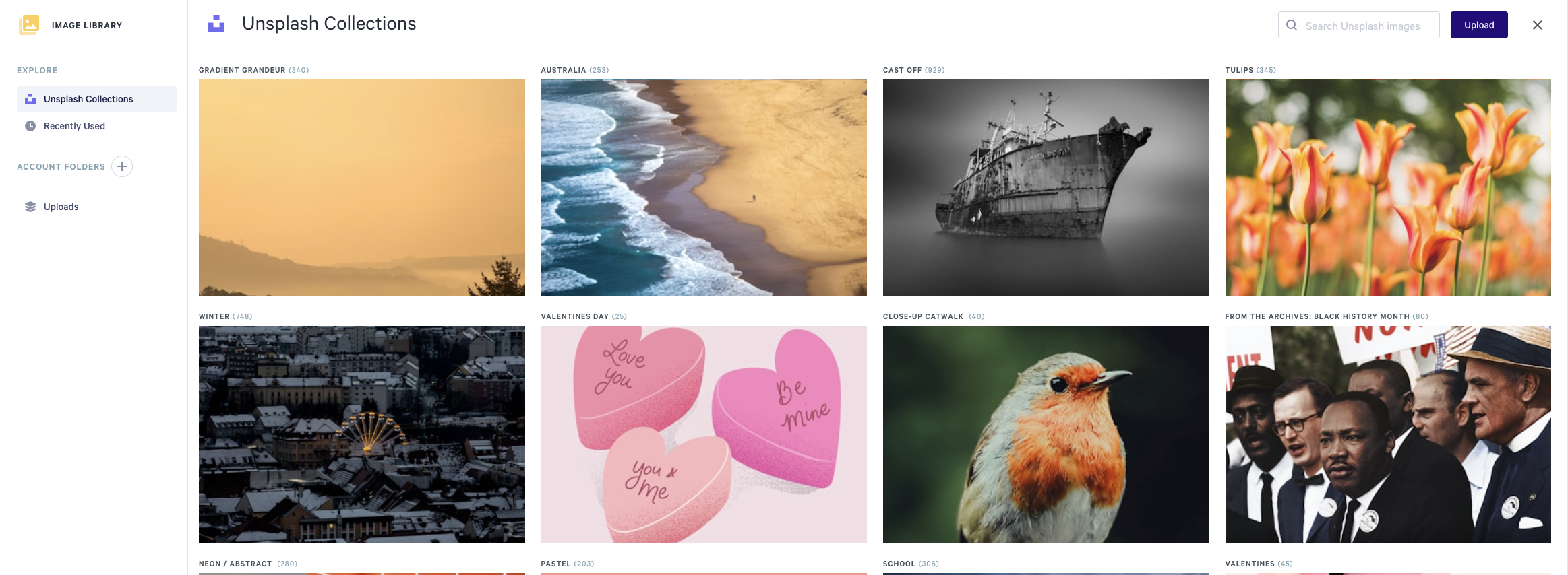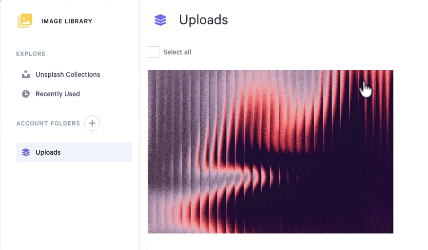 Note: The search is folder-specific. If you're in the Uploads folder, the search results will be uploads. If you're in the Unsplash folder, search results will be stock images.