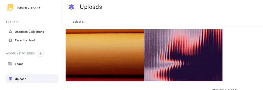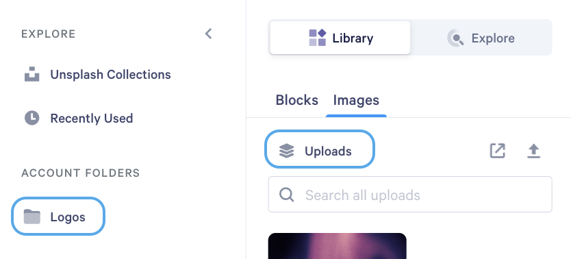 While you're in the full library view, you can set up folders to organize your uploaded images. Then your team will be able to access these folders from the sidebar view.