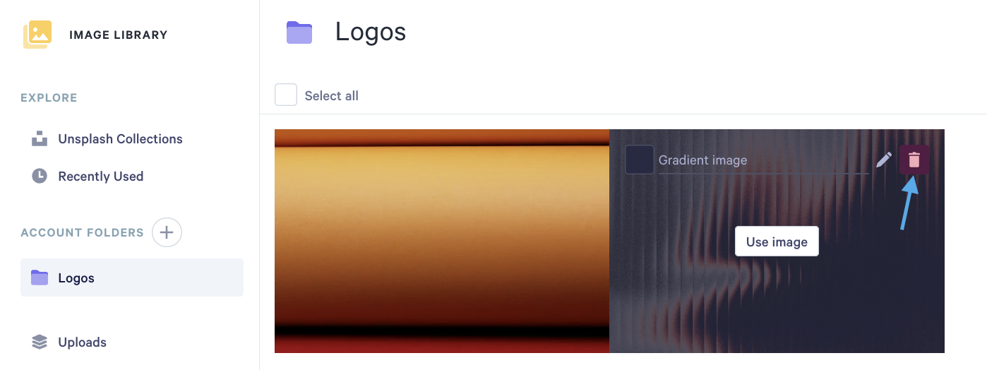 From there, hover over the thumbnail of the image you want to delete. A trash can icon will appear in the top right corner of the image. Click that to remove this image from your library.