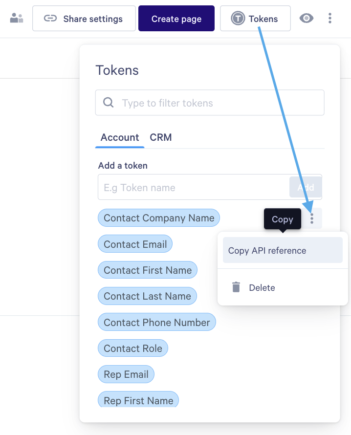 Open the Tokens tab in your Template and tap on the three dots next to the token. Click Copy API reference. Now you have the token name copied to the clipboard, and you can paste it into the Variables field.