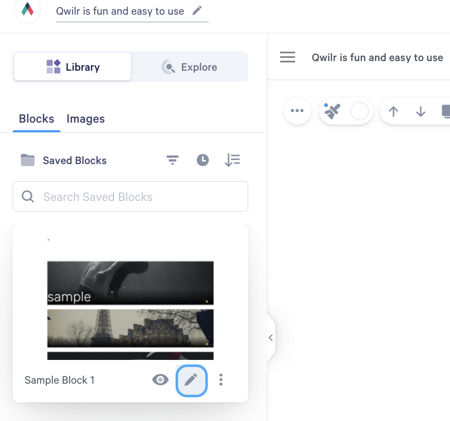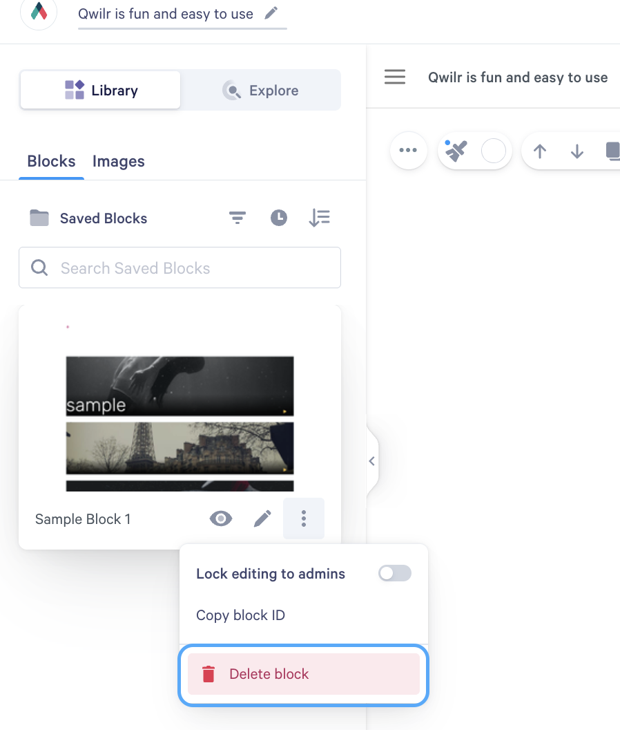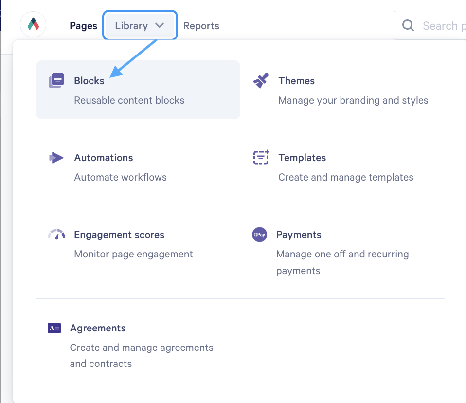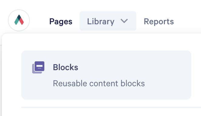 To access a more global view of your saved block library, head to the top left corner of the dashboard and click Blocks.