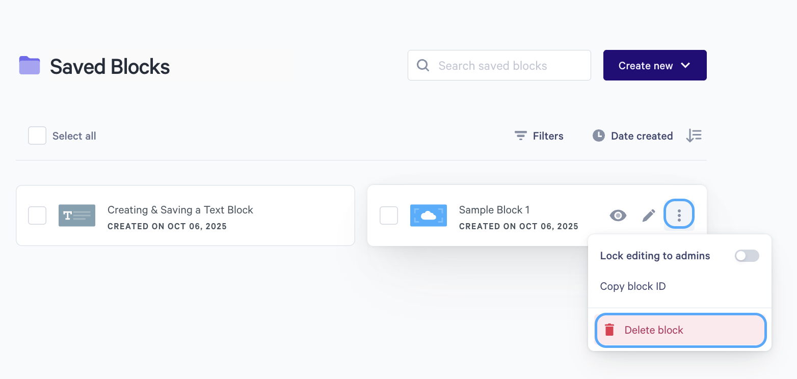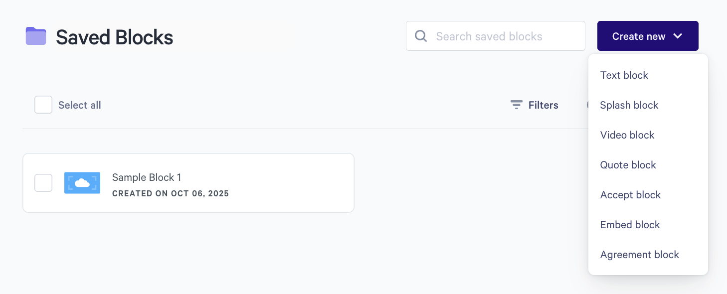 Head to the top right corner of your library and click the Create New button. Then choose the type of block you'd like to create.