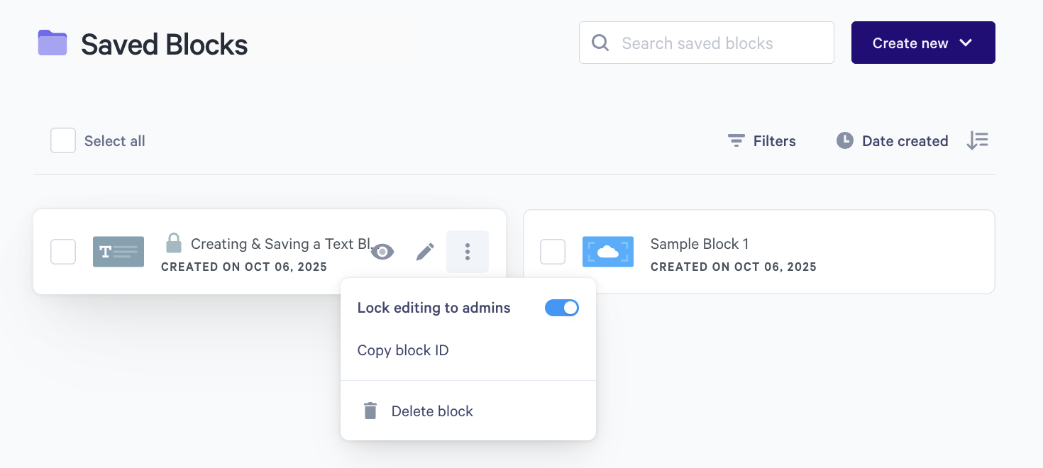 You can create new saved blocks from the dashboard view of your library any time. It's a great option if you need a new saved block, but don't want to work on a page.