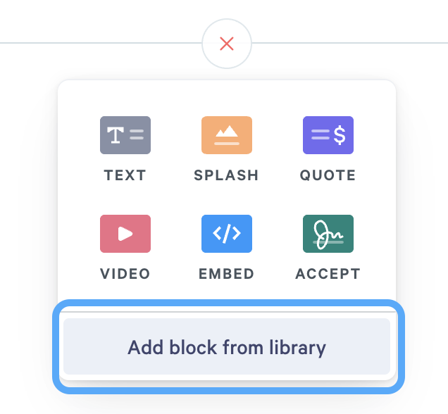 You can also locate the Plus icon between your blocks in the proposal, and click Add block from library, which will open your Library.