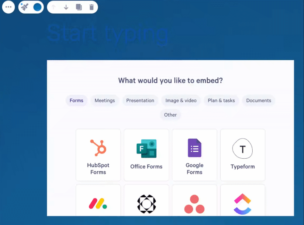 Step 1. Anywhere you're able to click on the + symbol in your Qwilr Pages and Templates, you'll now see the option to add embedded content from services like Calendly, Google Slides, Typeform, and iFrame.