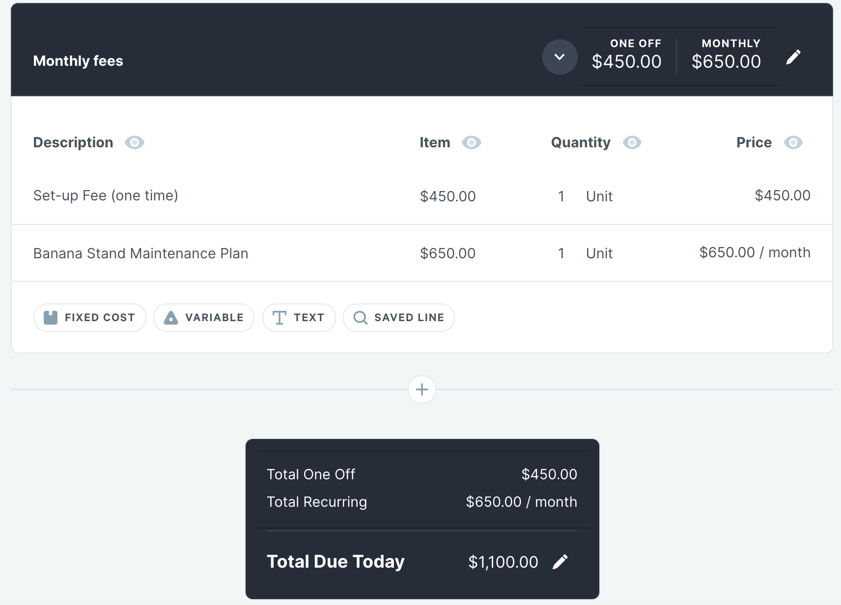 In the standard table-style quote, you can make either Fixed Cost or Variable lines into recurring charges. Depending on the quote, you might want to put all of your recurring charges into a separate section, or you can mix them in with your one-time charges.