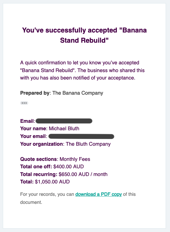 Qwilr includes recurring charges in this email. The quote total here will either include or exclude the first installment, depending on how you've set things up.