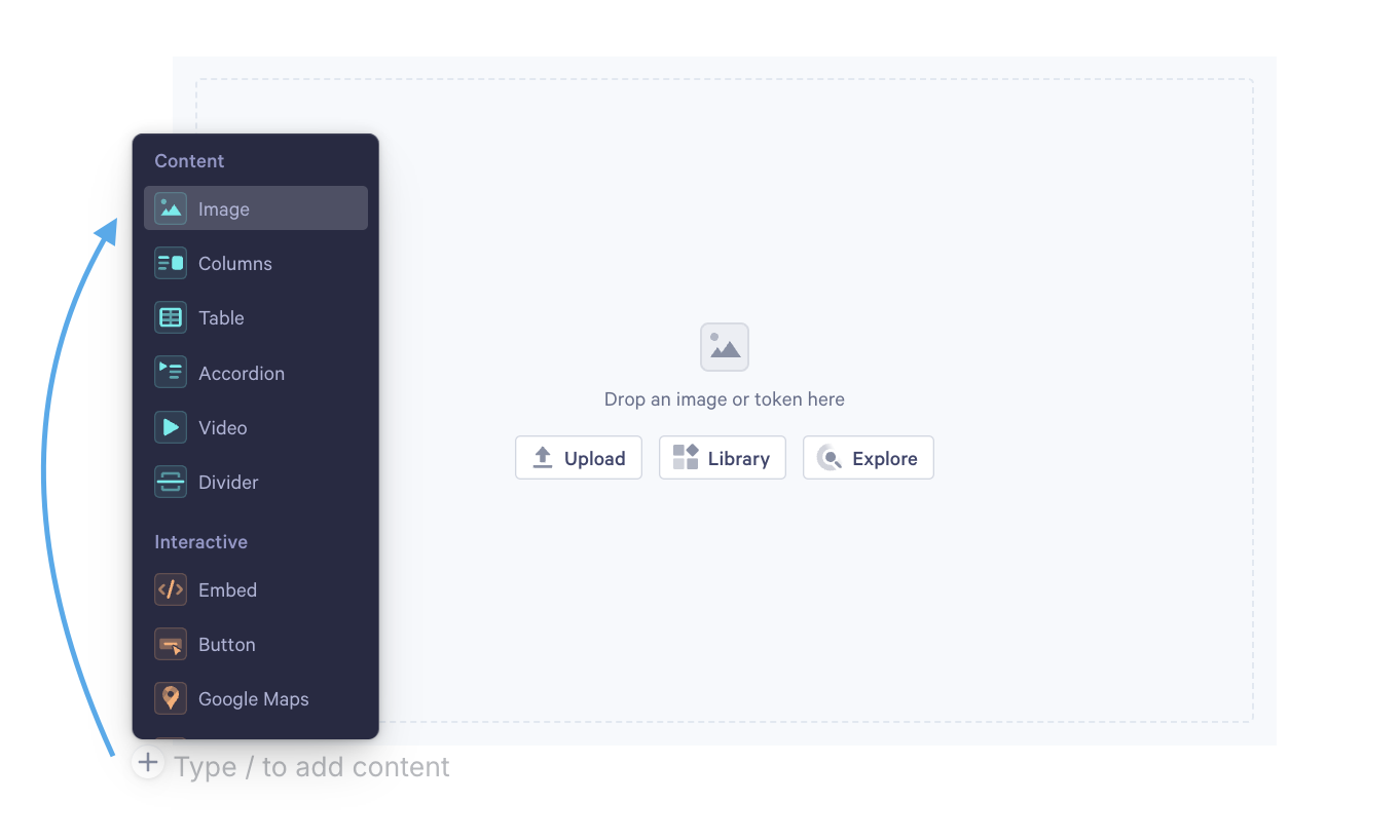 Step 2. Now, you'll add an image placeholder to your template. To do this, click on the + symbol on any blank line, then choose Image from the Widget Menu.