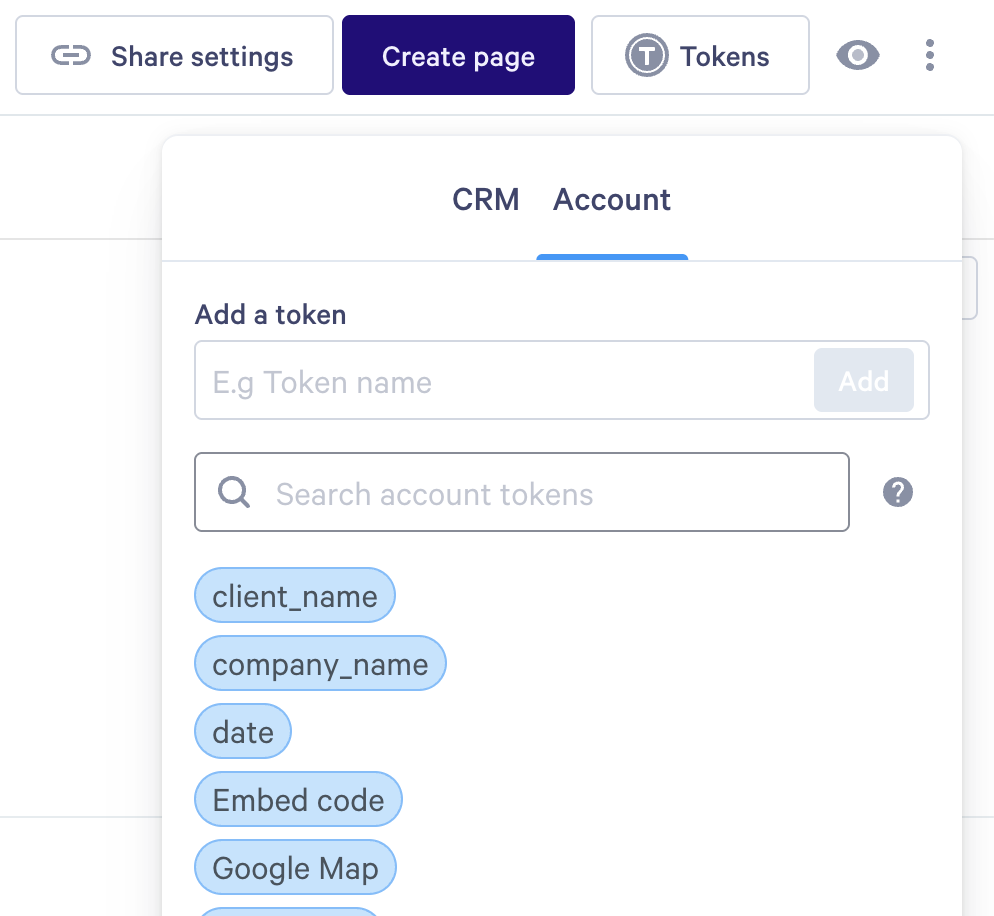 Step 2. Back in Qwilr, open your template for editing. Set up an account token for your map. It can be helpful to specify in the Token's name that it's a map.