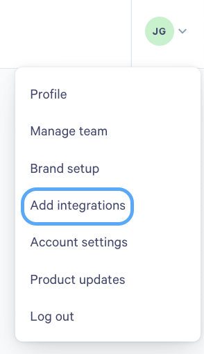 Step 1. Make sure you're logged into your Zoho CRM account. Then in Qwilr, head to the top right corner and click on your initials. Choose Add Integrations.