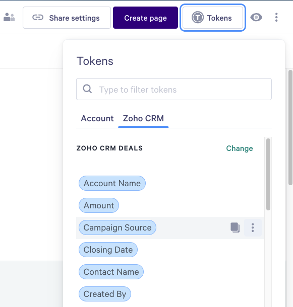 Step 2. It's time to connect this template to Zoho CRM. In the top right corner of the template, you'll now see a Tokens icon. Click that.
