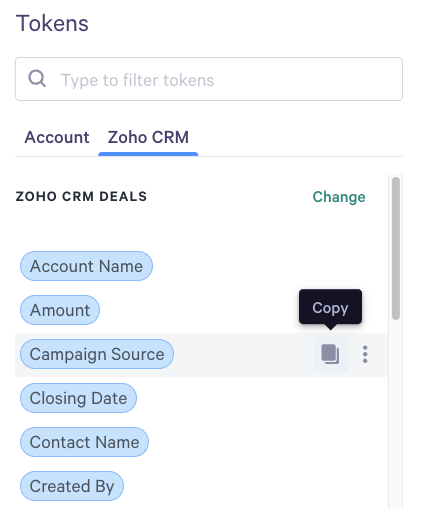 If you're still working on your template, the tokens list should still be open, but now displaying a list of available Zoho CRM tokens.