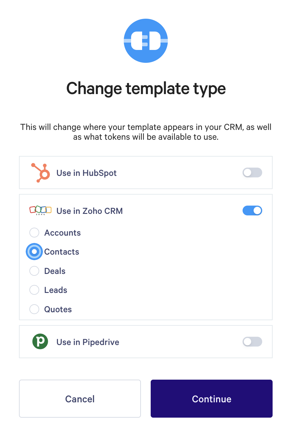 Step 4. Enable the Use in Zoho CRM switch, and then choose which type of Zoho CRM record you plan to work with: Leads, Accounts, Contacts, Deals, or Quotes. Click Confirm to save.