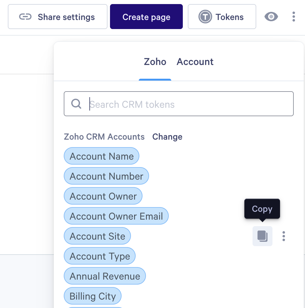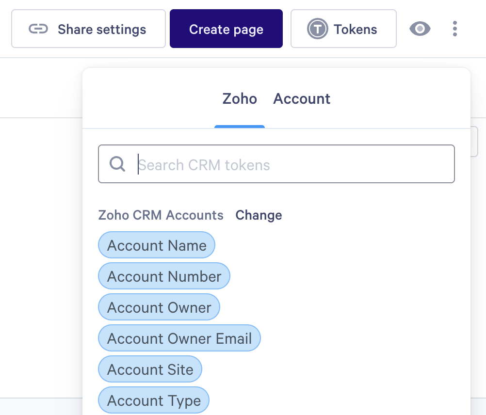 Note: The Account tab is for account tokens. If you're using the Zoho integration, you can use account tokens and Zoho tokens together in the same template — just make sure to use the Zoho tab for your CRM-specific tokens.