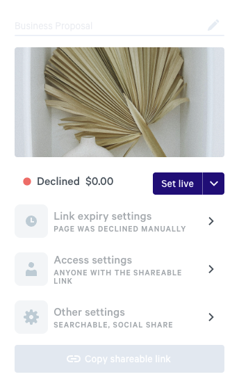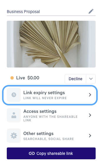 By default, Qwilr's public page URLs never expire. With the expiry setting, you can make the link active for a specific number of days. Once that time is up, the link will display an error message instead.