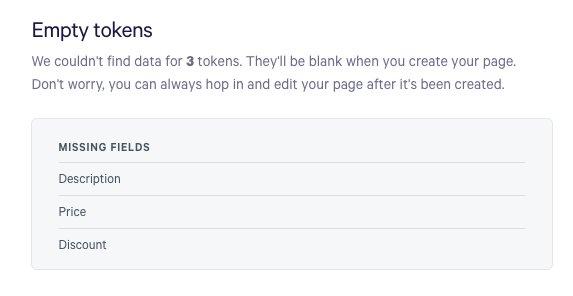 If there's no information in a particular Pipedrive field, you'll see a warning message like the one below. You can either head back to Pipedrive and fill in the field, or proceed with creating the page and add that information afterward.
