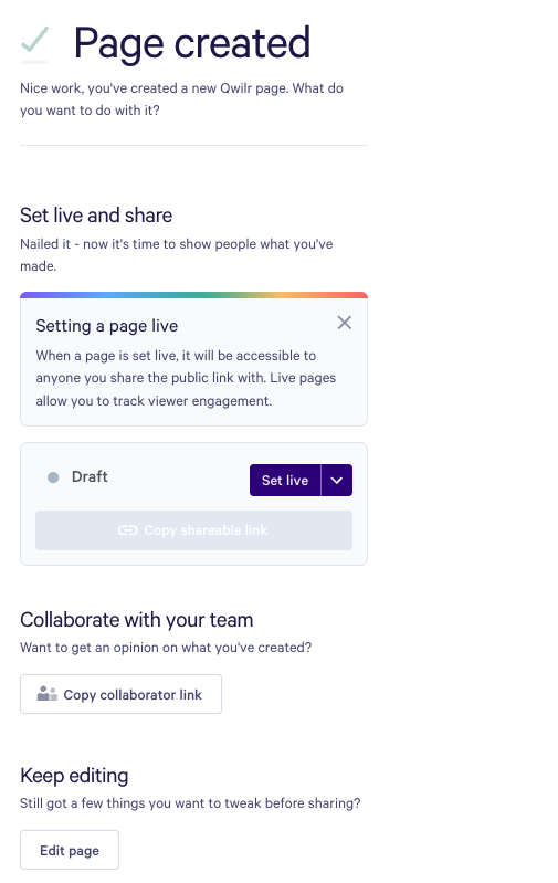 • If you want to keep editing the page, you can click through to the Qwilr editor and keep making changes. (If you choose this option, you'll still be able to get the public link and Collaborator link later.)