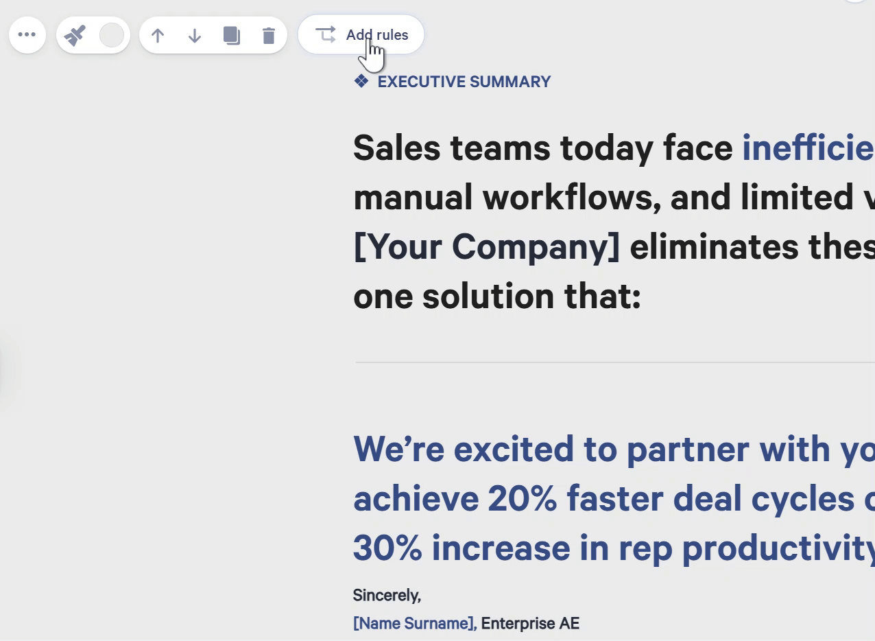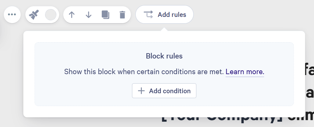 For Enterprise accounts with conditional content enabled, you should see a brand new option in your template editor in the top left menu of each block, Add rules.