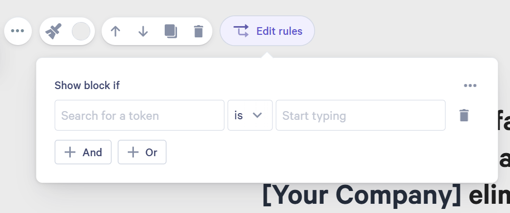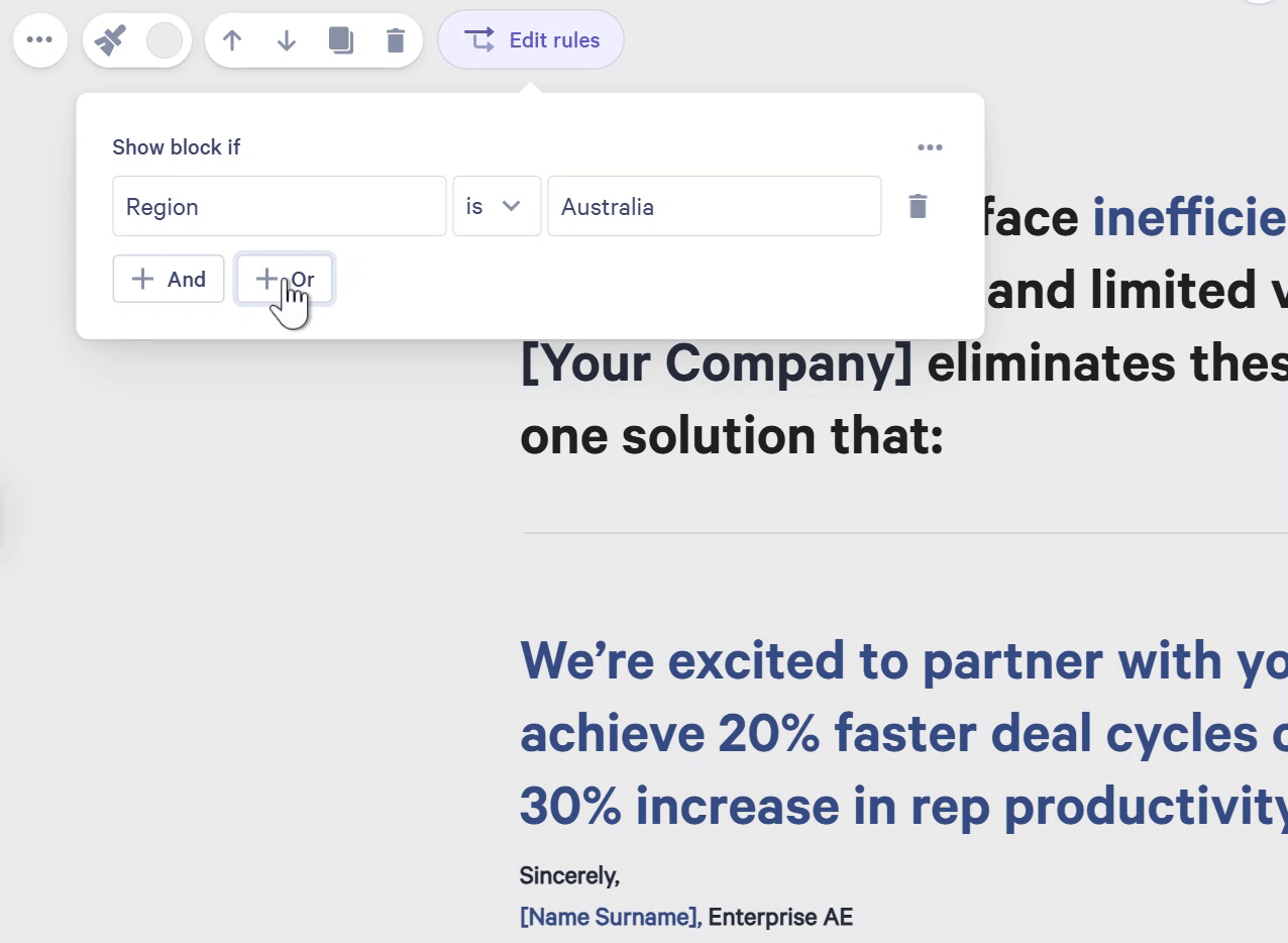 Qwilr allows multiple conditions to be applied in a block to define which blocks show up on the page. You can utilize either the And or Or modifier.